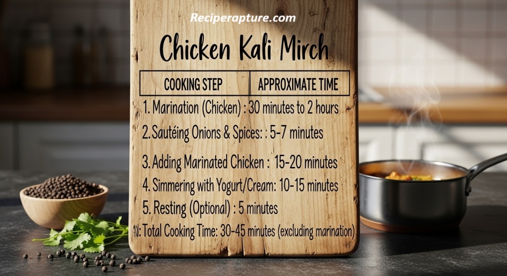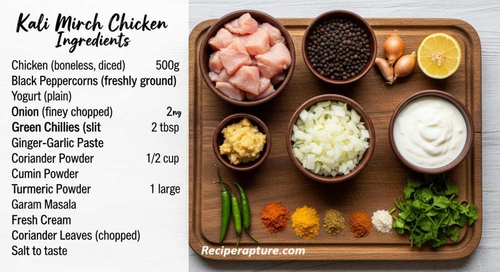 The essence of Kali Mirch Chicken lies in freshly ground black pepper, which gives warmth and a gentle kick without overpowering heat. Bone-in chicken is used for depth of flavor, while onions and yogurt create a creamy base. Ginger-garlic paste gives a strong foundation, while green chilies add fragrance. Ghee (or oil) makes the curry rich, and cream is sometimes added at the end for a restaurant-style finish. Garnishes like julienned ginger and coriander brighten the dish.
