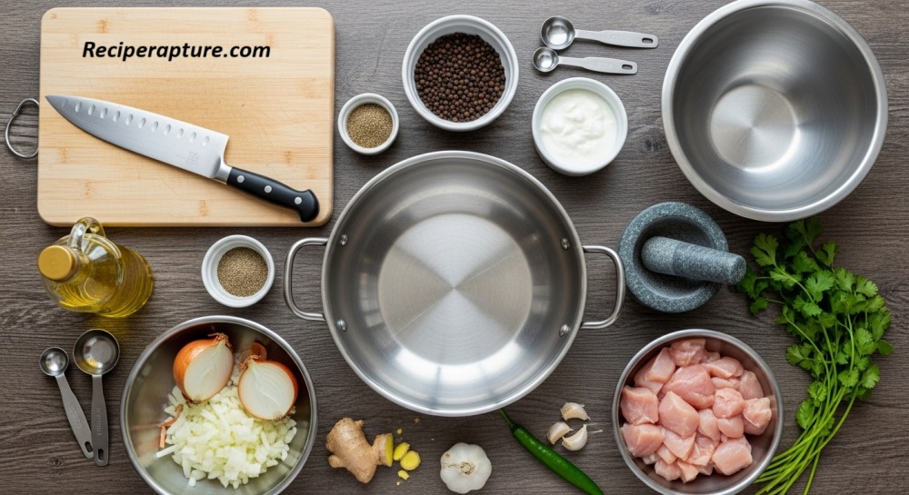 You’ll need a heavy-bottomed karahi or pan to prevent yogurt and spices from burning. A sharp knife and chopping board for prepping onions, ginger, and chicken. A grinder or mortar and pestle to grind fresh black pepper. A spatula or wooden spoon for stirring, and a lid for simmering the chicken gently. If baking naan or paratha alongside, a rolling pin and tava/griddle come in handy.