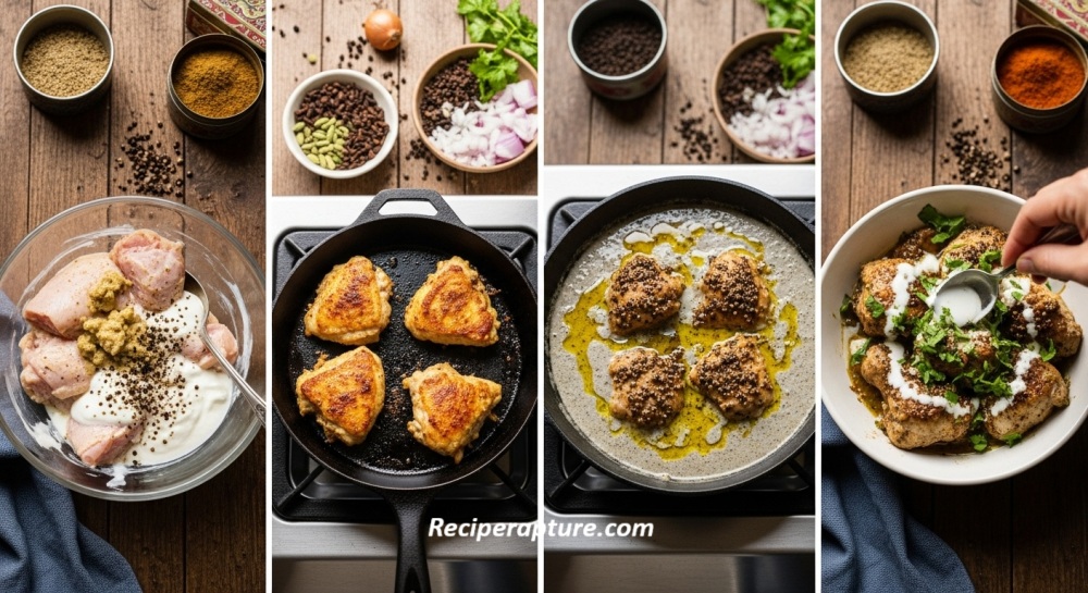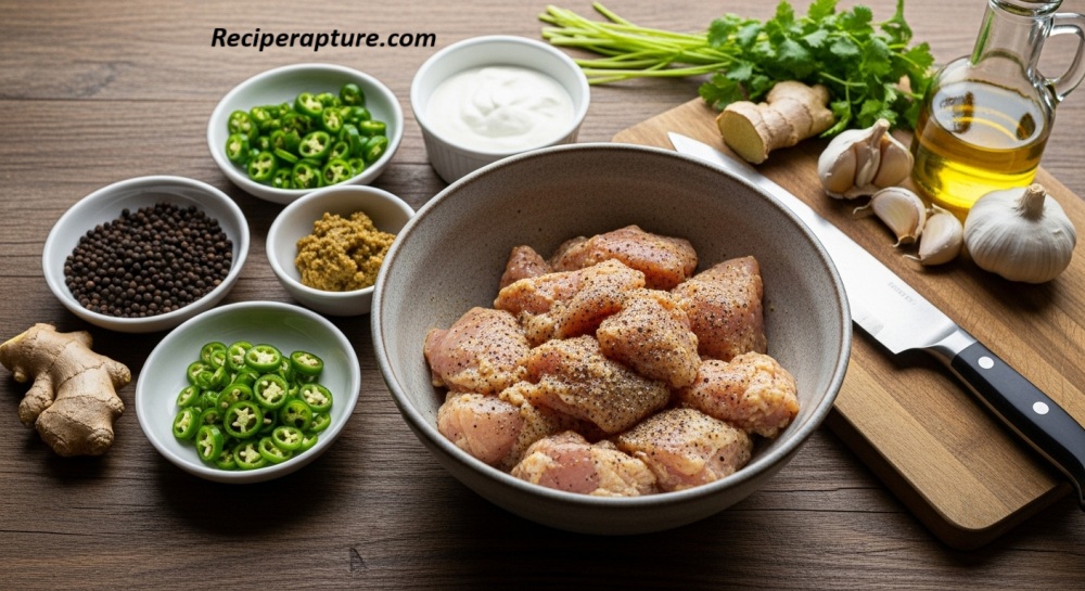 Wash chicken thoroughly and cut into medium-sized pieces. Thinly slice onions so they cook down evenly. Whisk yogurt until smooth to prevent curdling. Grind black pepper fresh for maximum flavor. Slit green chilies or chop finely depending on spice tolerance. Prepare ginger-garlic paste fresh if possible. Chop coriander leaves and julienne ginger for garnish. Keep all spices measured and ready before starting, as this dish cooks quickly once the base is ready.