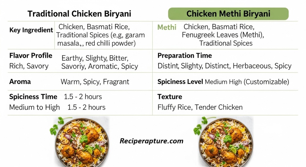 | Chicken Methi Biryani | Includes fresh fenugreek leaves | Earthy, slightly bitter, aromatic |