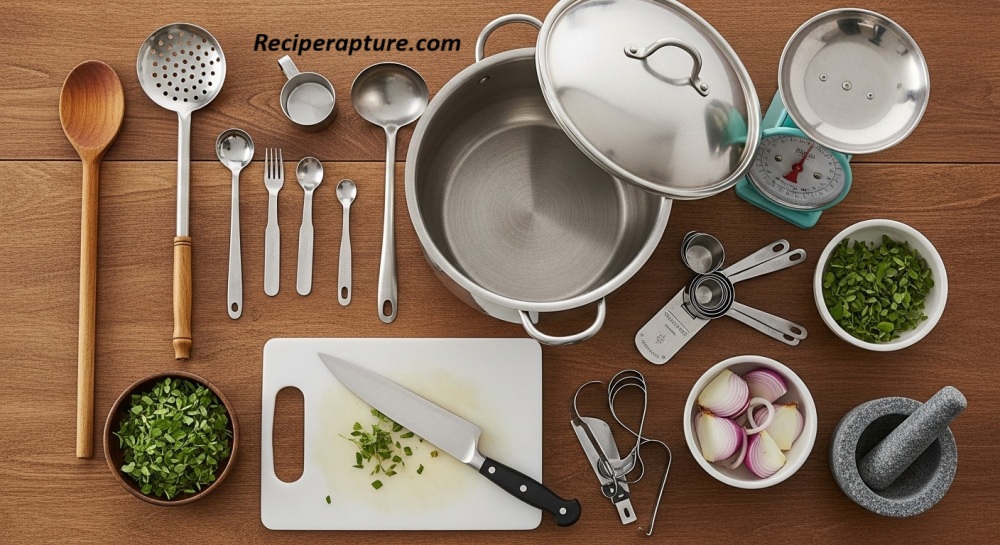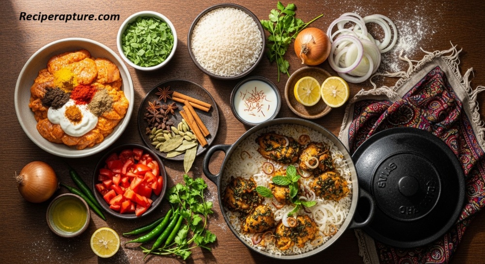 You’ll need a large heavy-bottomed pot (degchi or handi) for cooking the biryani on dum (steam). A deep frying pan for browning onions and a strainer for draining parboiled rice. A sharp knife and chopping board for herbs and chicken. A small bowl for soaking saffron (optional). A tight-fitting lid or foil is essential to trap steam while layering.