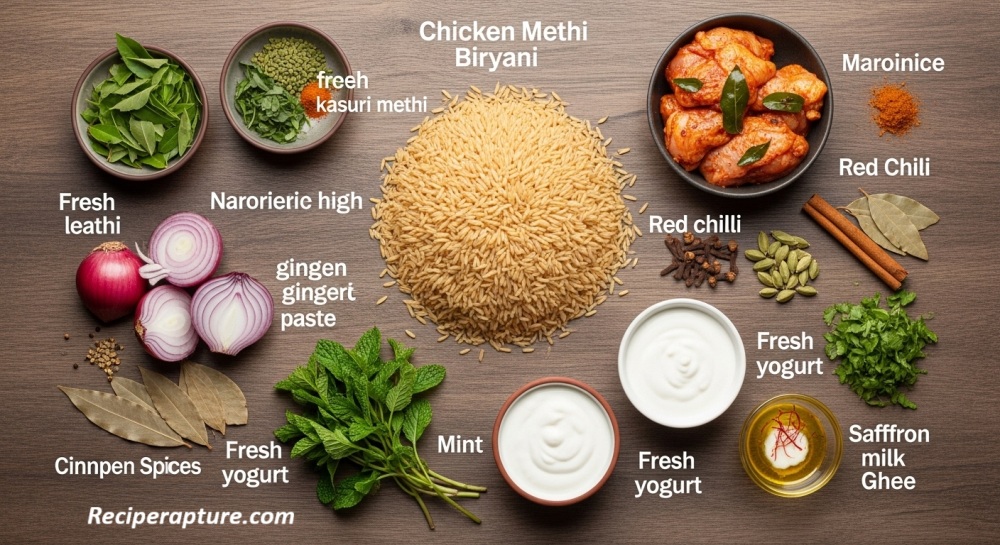 The key to this biryani is fresh methi (fenugreek leaves). Its slightly bitter, earthy taste balances beautifully with the richness of chicken and basmati rice. Chicken (preferably bone-in) is marinated with yogurt, ginger-garlic paste, chili, and whole spices for deep flavor. Tomatoes add body, while onions provide caramelized sweetness. Fresh herbs (mint & coriander) and a pinch of garam masala complete the fragrance. Basmati rice is used for long, fluffy grains, and saffron or food coloring gives that signature biryani look.