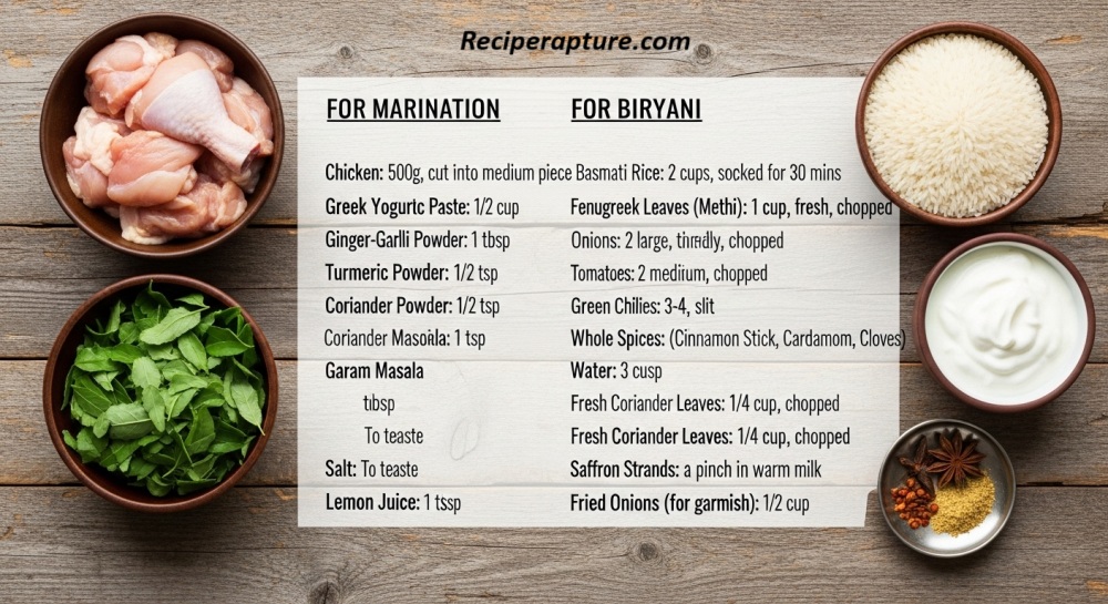 Clean and wash the chicken. Marinate with yogurt, ginger-garlic paste, ground spices, and salt. Wash methi leaves thoroughly and chop finely. Slice onions for frying until golden brown. Parboil basmati rice with whole spices (cumin, cardamom, and bay leaf) until 70% cooked, then drain. Prepare fresh herbs like coriander and mint for layering. Beat yogurt smooth, and measure spices in advance to avoid overcooking.