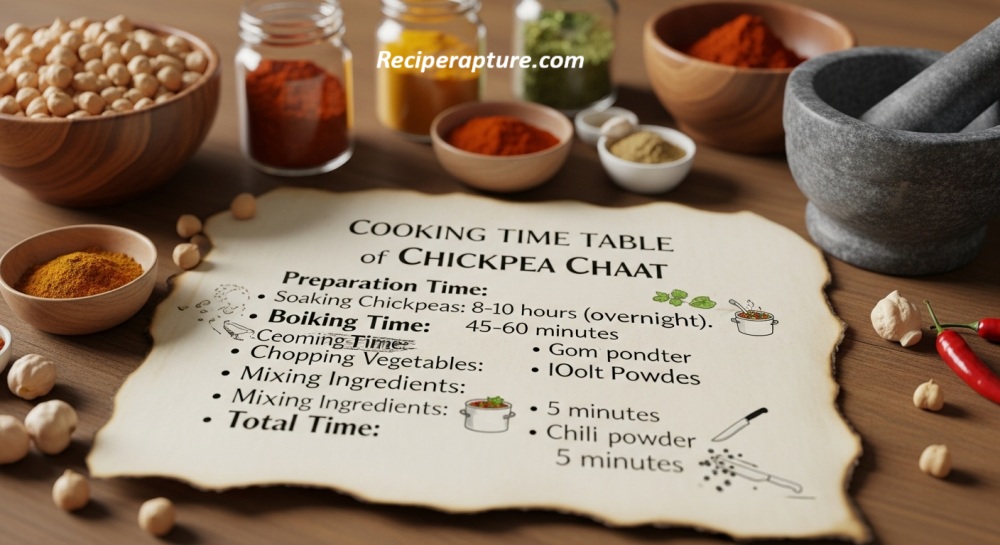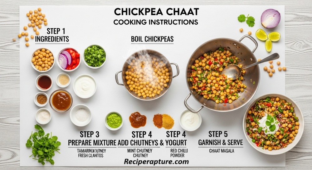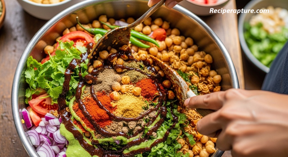 | Assembling Chaat | 5 mins | Toss chickpeas, veggies, spices, chutneys |