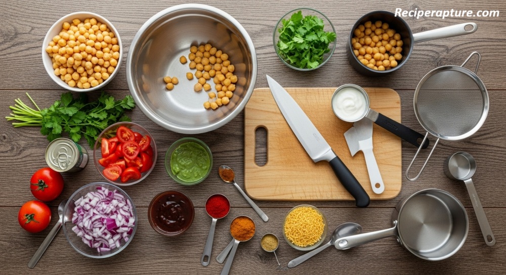 You don’t need much for this snack. A mixing bowl, cutting board with knife, and a spoon are essentials. A sieve/colander helps drain chickpeas well. If you’re making fresh chutneys, you’ll need a blender or mortar-pestle. For serving, small bowls or glass cups work great to present chaat in portions.