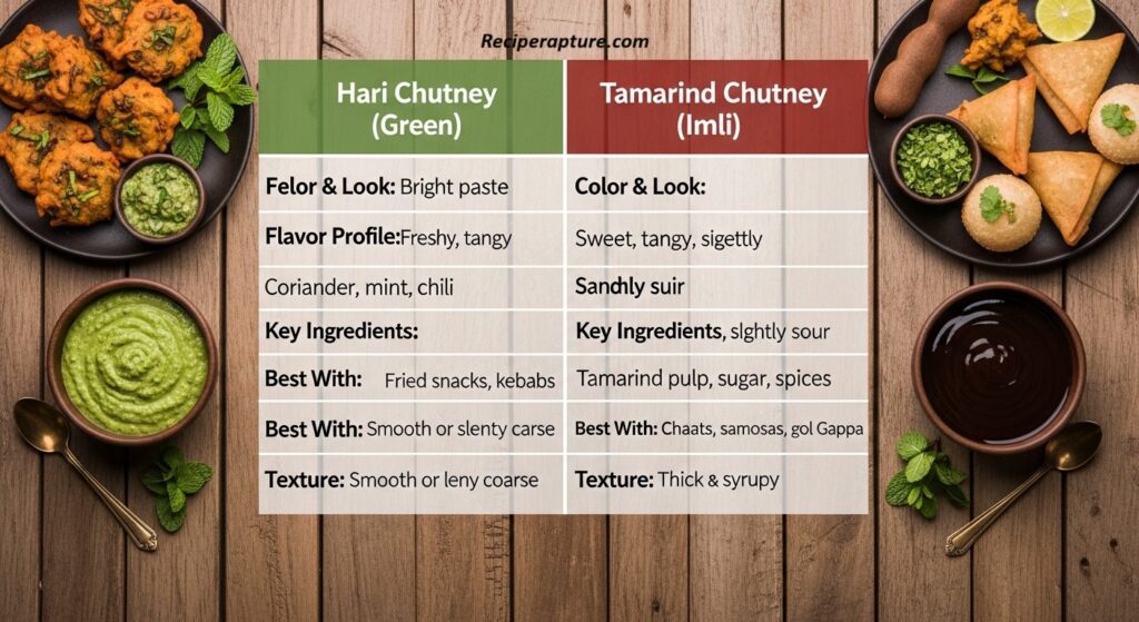 | Feature | Hari Chutney (Green) | Tamarind Chutney (Imli) |