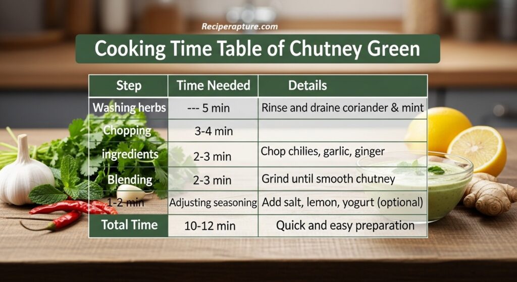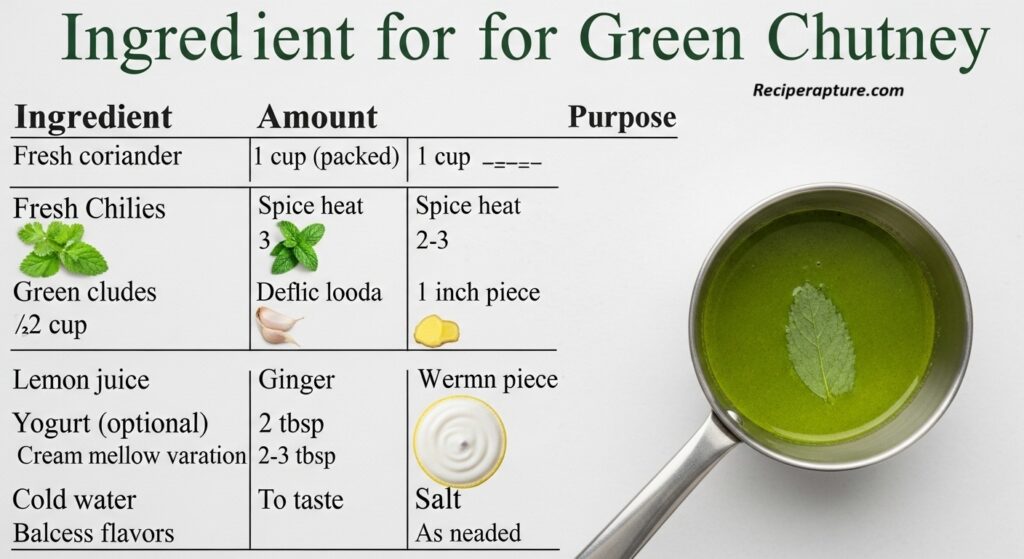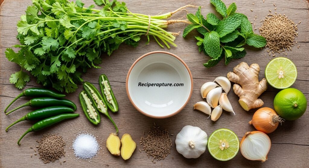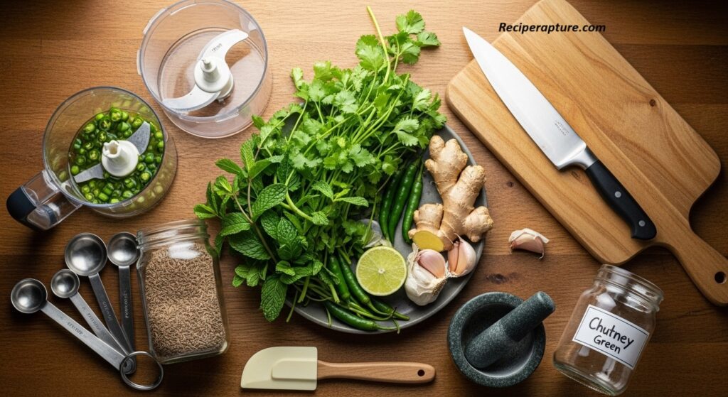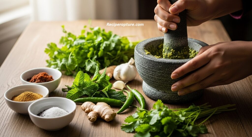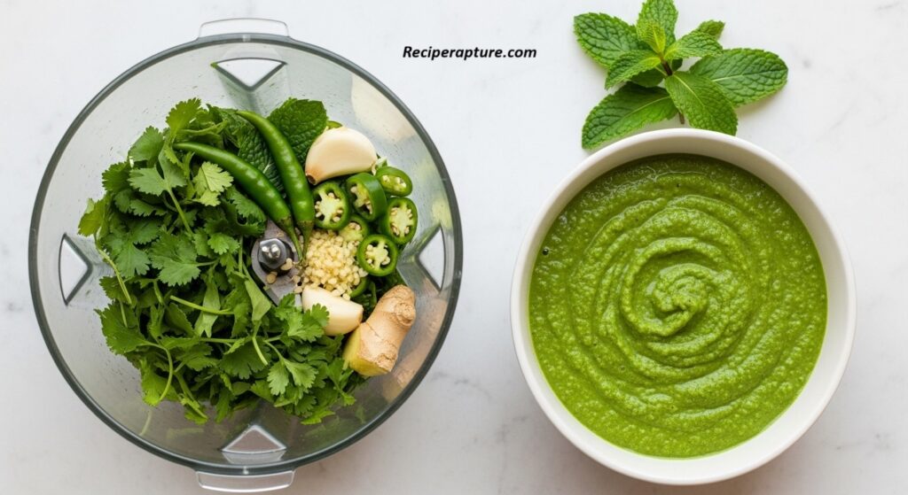 Start by washing coriander and mint leaves thoroughly to remove grit. Roughly chop green chilies, ginger, and garlic to make blending easier. If using yogurt, whisk it separately until smooth. Prepare lemon juice for tang. Set aside all ingredients, as blending should be quick to retain the chutney’s vibrant green color.