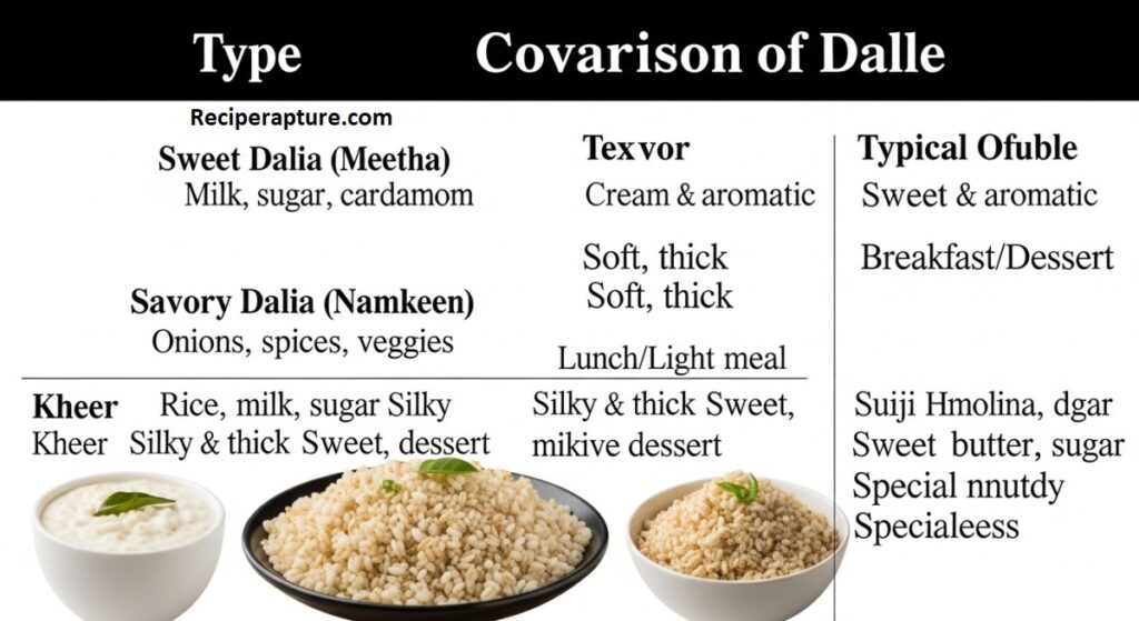 | Savory Dhalia (Namkeen) | Onions, spices, veggies | Soft, thick | Spicy & hearty | Lunch/Light meal |
