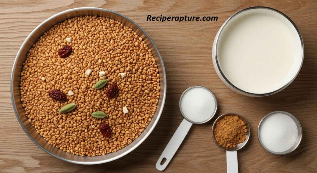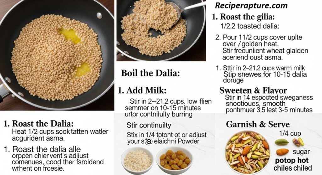 Before starting, rinse the cracked wheat in water to remove dust. Optionally, dry roast it in ghee until golden brown for a deeper flavor. Warm up your milk separately, so it mixes smoothly without curdling. Chop any dry fruits you’d like to add. Have your sugar and cardamom powder measured and ready. Proper prep makes cooking quick and fuss-free.