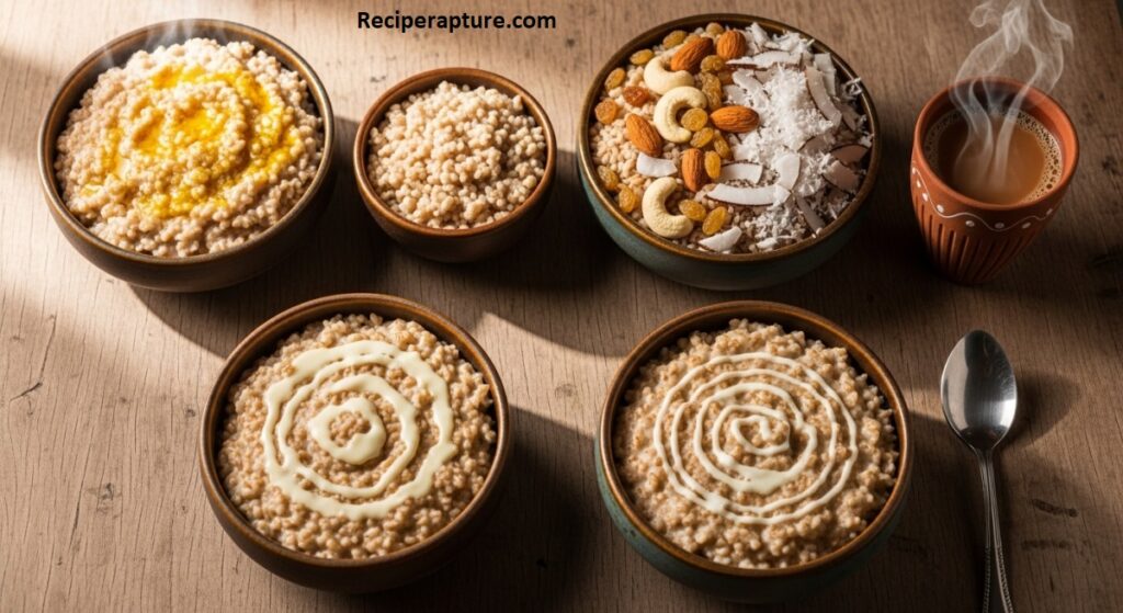 This recipe captures the traditional homemade flavor rich, lightly spiced, and just sweet enough to start your morning with warmth. You can enjoy it plain or topped with dry fruits and nuts for extra indulgence.