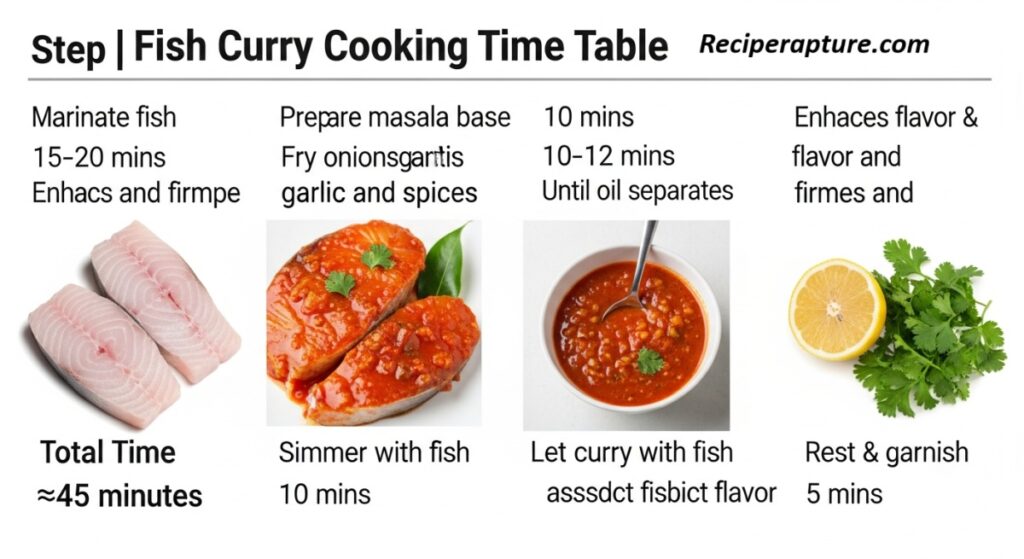 | Simmer with fish | 10 mins | Let fish absorb curry flavor |