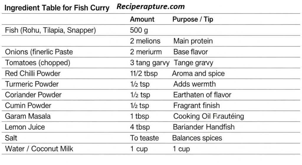 - Fish Fillets (or pieces with bone): The heart of the dish—choose firm varieties like Rohu, Snapper, or Tilapia that don’t fall apart easily.