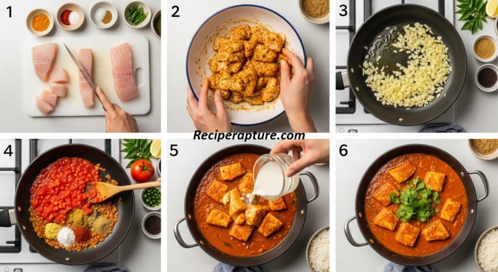 Cook uncovered for 8–10 minutes until the fish is tender and fully infused with the masala.