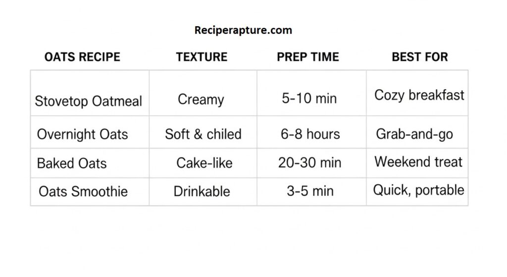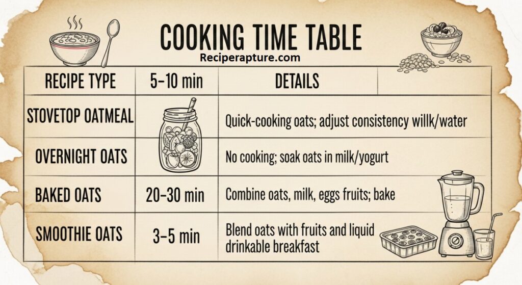 | Overnight Oats | 6–8 hours | No cooking; soak oat’s in milk/yogurt |