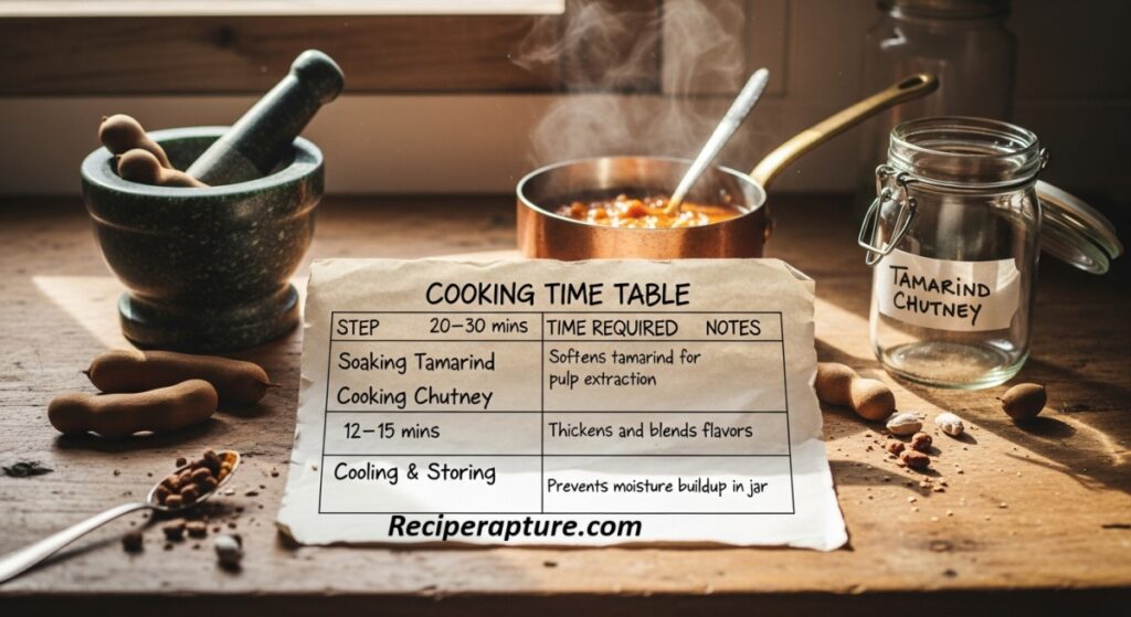 | Soaking Tamarind | 20–30 mins | Softens tamarind for pulp extraction |