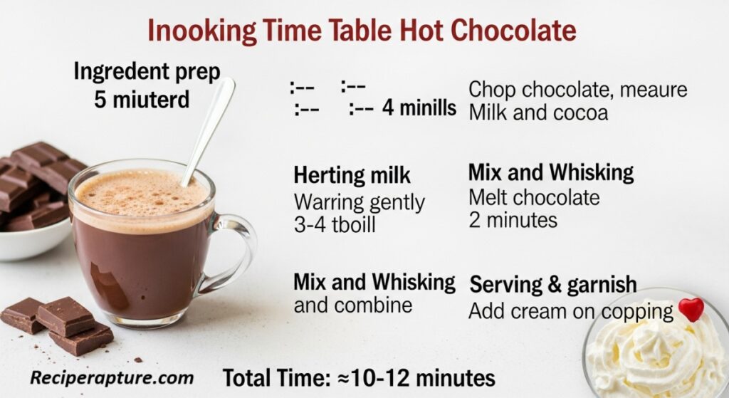 | Ingredient prep | 5 minutes | Chop chocolate, measure milk and cocoa |