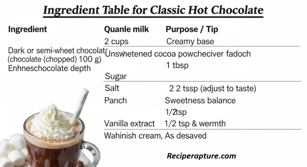 Ingredient Table for Classic Hot Chocolate