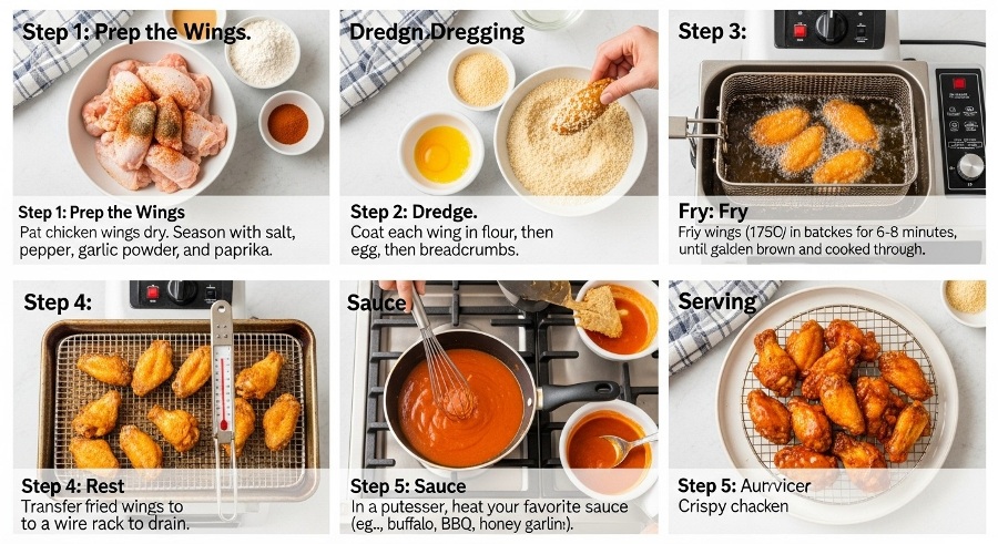 The star of the dish is, of course, chicken wings. They’re naturally fatty, which helps them crisp up. Baking powder and salt are the real game-changers they draw out moisture from the skin, creating the golden, crunchy coating we love. A mix of paprika, garlic powder, and black pepper adds flavor without overpowering the chicken. Oil is needed either for deep frying or for brushing/baking. Sauces (like buffalo, honey garlic, or BBQ) are optional finishes depending on your taste.