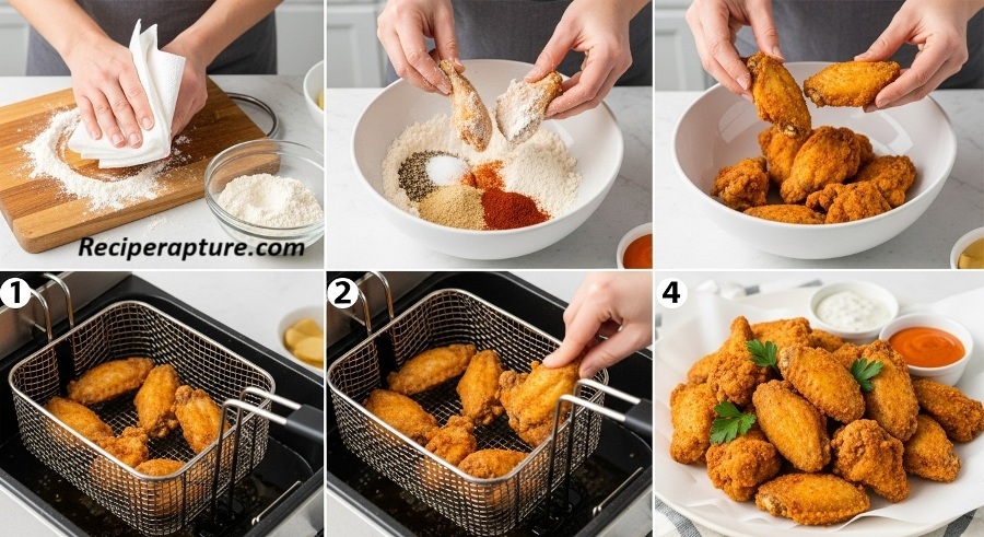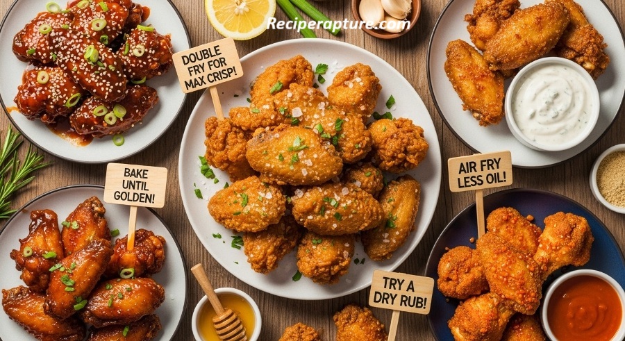 Pat wings completely dry with paper towels moisture is the enemy of crispiness. If wings are whole, cut them into drumettes and flats. In a mixing bowl, toss wings with baking powder, salt, and spices until coated evenly. For maximum crisp, refrigerate the seasoned wings uncovered for 30 minutes before cooking (optional but highly recommended). Preheat your oven, fryer, or air fryer while wings rest.