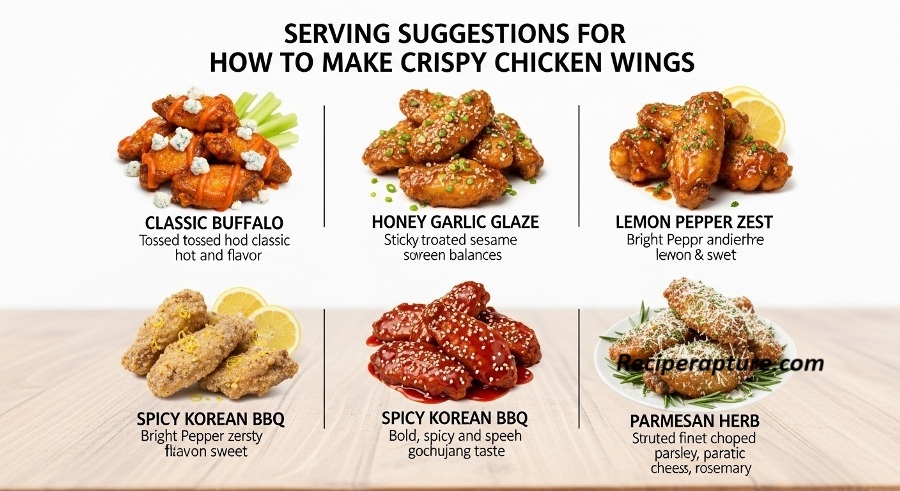 Crispy wings pair best with dipping sauces like ranch, blue cheese, garlic mayo, or honey mustard. Classic sides include celery and carrot sticks. For saucy variations, coat wings in Buffalo sauce, BBQ glaze, teriyaki, or honey garlic right after cooking. Serve them hot for maximum crunch.