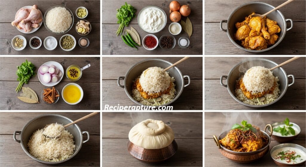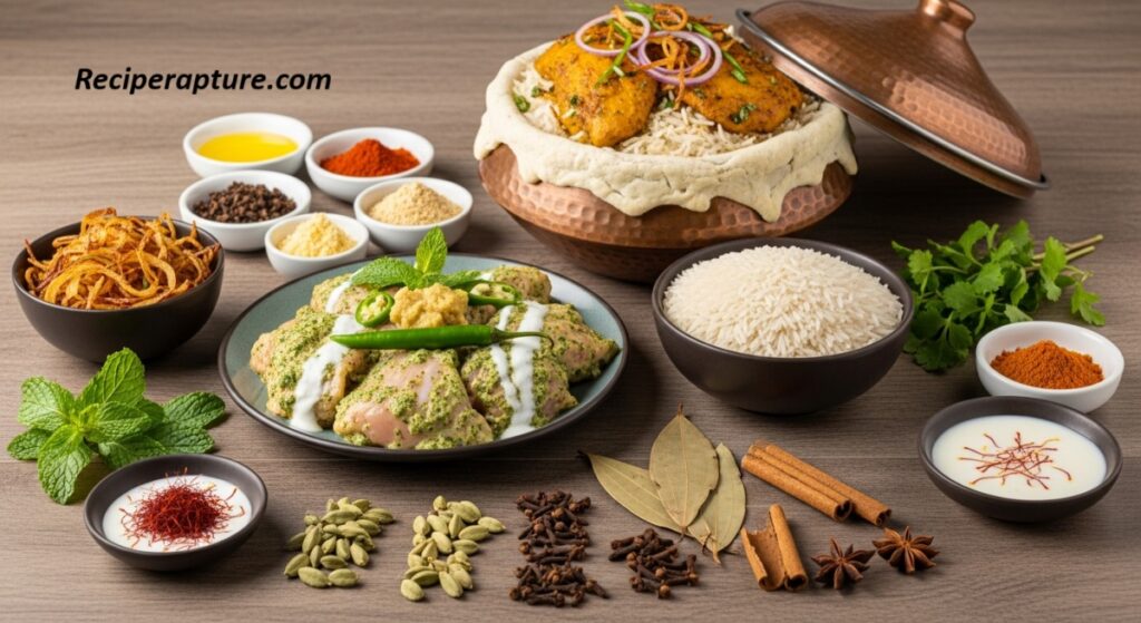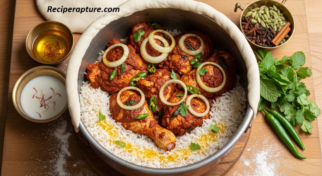 The core of Hyderabadi Chicken Dum Pukht lies in its balance of rice, marinated meat, and aromatic spices. The basmati rice gives a long, fluffy texture, while chicken is marinated in yogurt, fried onions, ginger-garlic paste, and warm spices like cardamom, cloves, and cinnamon. Fresh herbs, mint and coriander infuse the dish with fragrance, while saffron-infused milk adds richness and color. A touch of lemon juice brings brightness, and fried onions provide that signature Hyderabadi depth.
