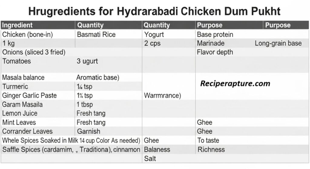 Ingredient Table for Hyderabadi Chicken Dum Pukht