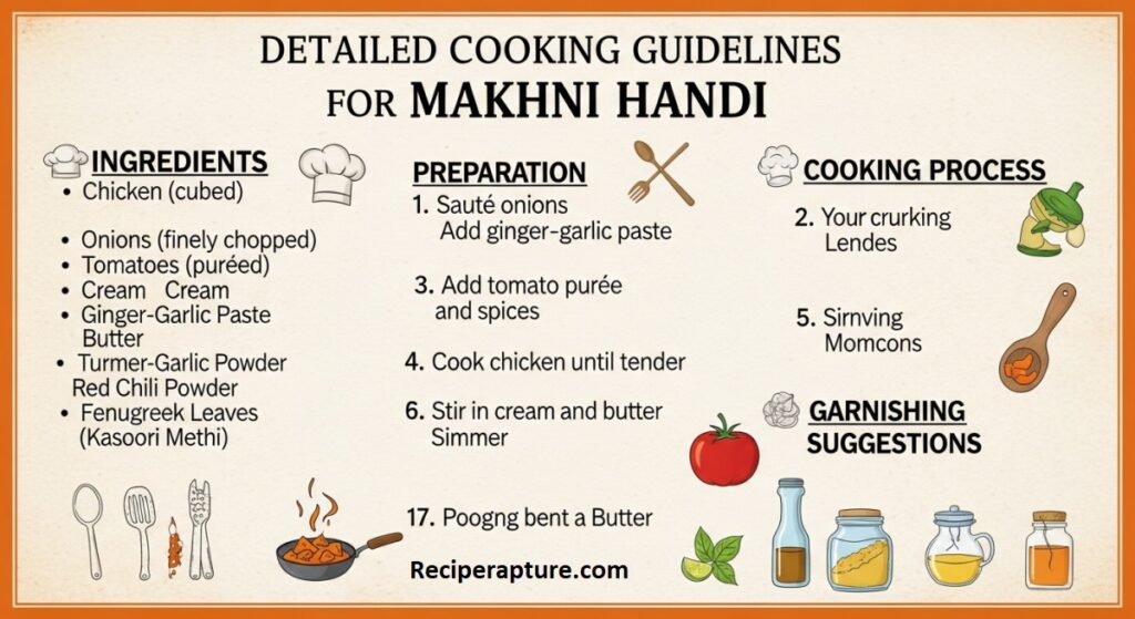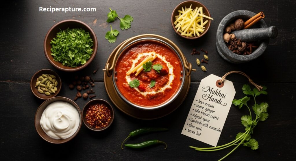 The marinade and gravy are the key components of Makhni Handi. Ripe tomatoes create a thick, naturally sweet base, and boneless chicken (preferably thighs) guarantees juiciness. Ginger-garlic paste adds fragrant depth, while butter and cream produce the distinctive smooth texture.