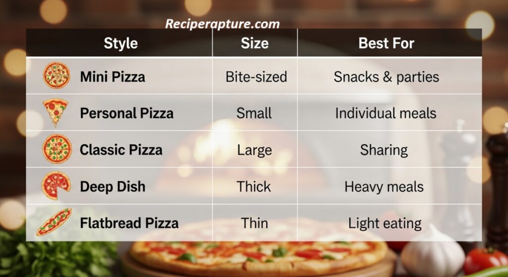 | Mini Pizza | Bite-sized | Snacks & parties |