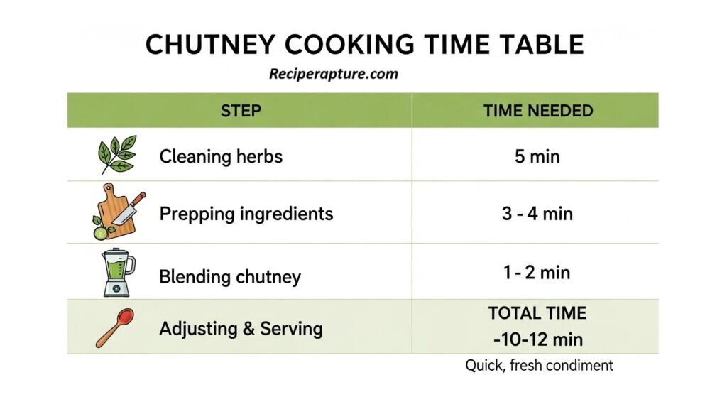 | Blending chutney | 2–3 min | Grind all ingredients until smooth |