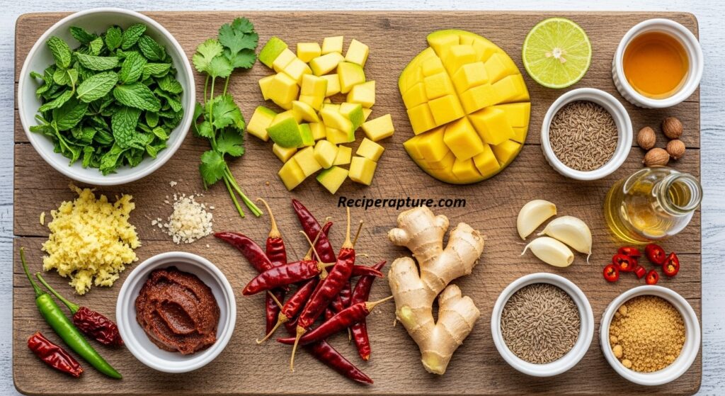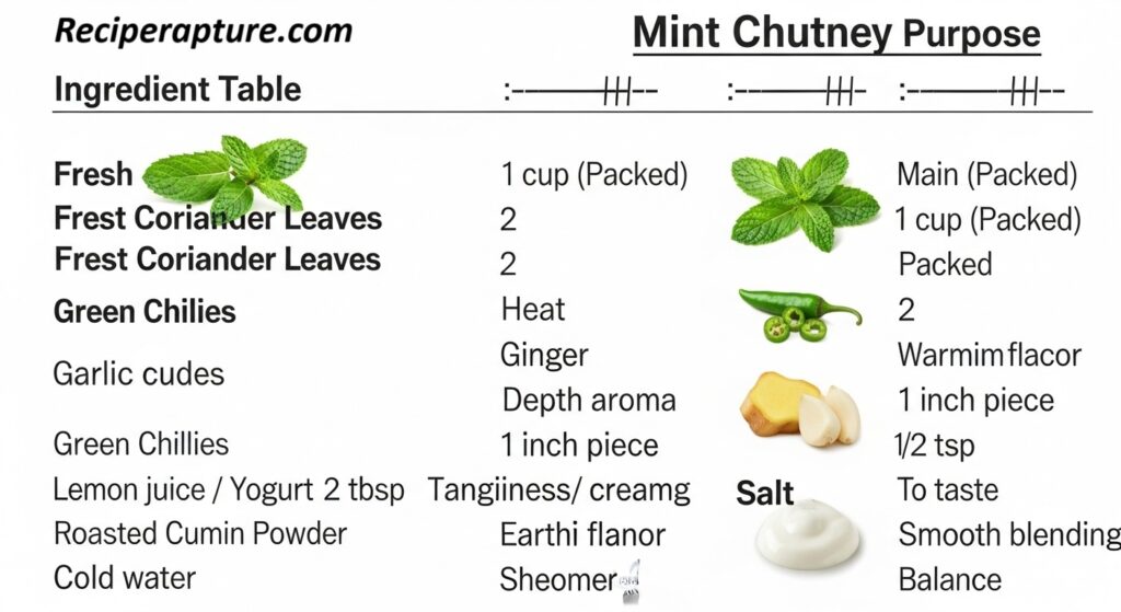 The heart of this chutney is, of course, fresh mint leaves, which give a cooling and aromatic base. Coriander leaves are often added to balance out the sharpness of mint, while green chilies bring heat. Garlic and ginger add depth, while lemon juice or yogurt brings tang and creaminess. Salt balances everything, and a touch of cumin powder or roasted cumin seeds adds earthiness. This combination creates a chutney that’s fresh, spicy, tangy, and irresistible.