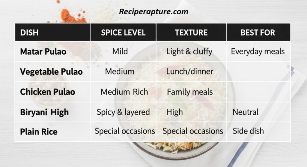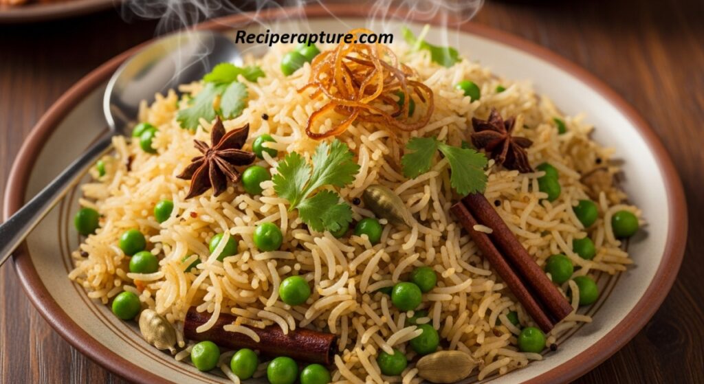 Unlike heavily spiced biryanis, Matar Pulao focuses on balance, aroma, and simplicity, making it perfect for everyday meals or as a gentle side dish.