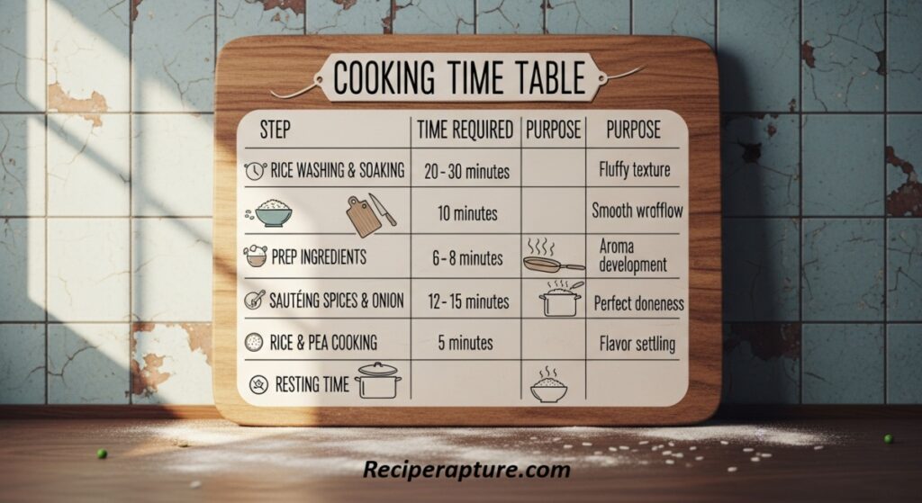 | Rice Washing & Soaking | 20–30 minutes | Fluffy texture |