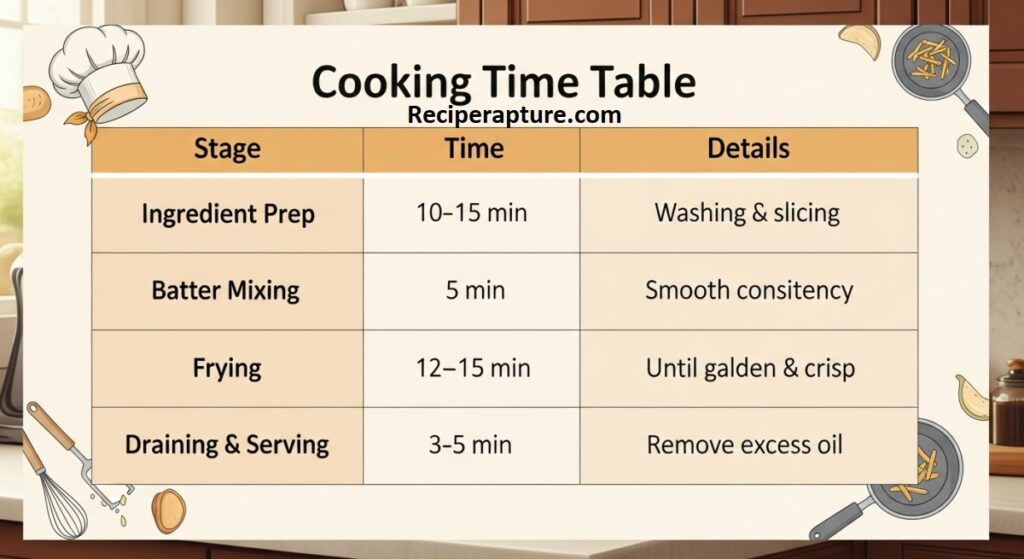 | Draining & Serving | 3–5 min | Remove excess oil |
